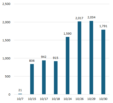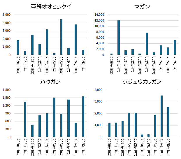 図4は、高度50mから撮影した写真を三日月沼に重ねている図です。四角いメッシュ状に並んでいるのがドローンで撮影した48枚の写真で、これらを1枚の画像に合成してAIソフトを使ってカウントします。図5は高度25mの写真で、シジュウカラガンとハクガンが写っています。カウント用の撮影は40~50mで行うのでこれより不鮮明な写真になりますが、高度が高いほど撮影時間が短くて済むため、種判別が可能な限界の高度から撮影を行うようにしています。もちろん、高度が高いほどガン類にプレッシャーを与えないということも大切なポイントです。シジュウカラガンの数は空撮を始めた10月上旬が最大で、約9,000羽でした。しかしシジュウカラガンの数が減り始めるとマガンが混ざるようになり、空撮写真では両種の識別が不完全なので継続したカウントはできませんでした。一方、真っ白なハクガンは識別に迷うことがありませんので、継続してカウントしたところ10月下旬に数が最大になり、約2000羽がねぐら入りしました(図6)。このあと11月4日の空撮ではハクガンがいなくなっていて、その後も三日月沼に戻りませんでした。吉田さんが11月5日に近隣の農場で約200羽を観察されているので、ねぐらが移動したのか、別のねぐらの群れなのか分かりませんが、これがこの秋に大きな群れを見た最後になりました。