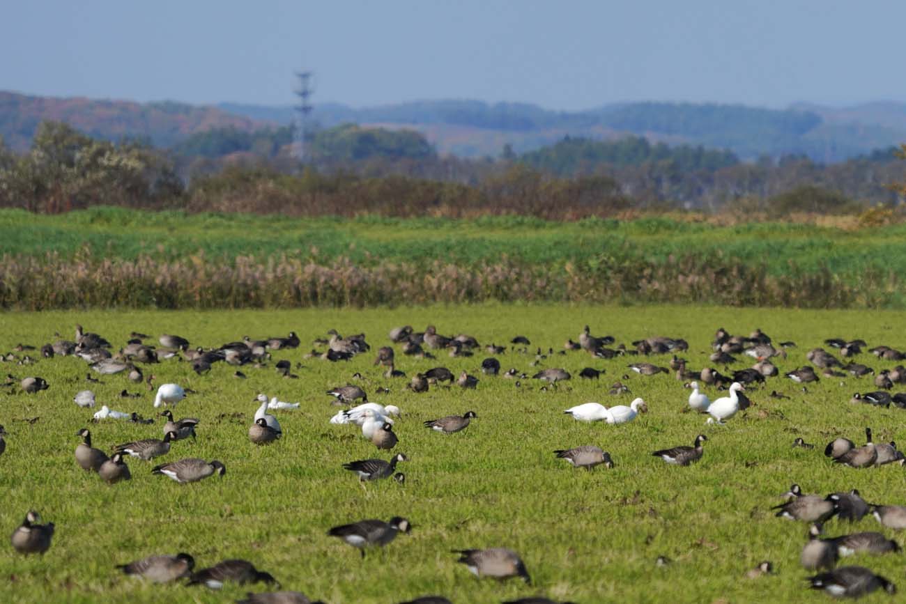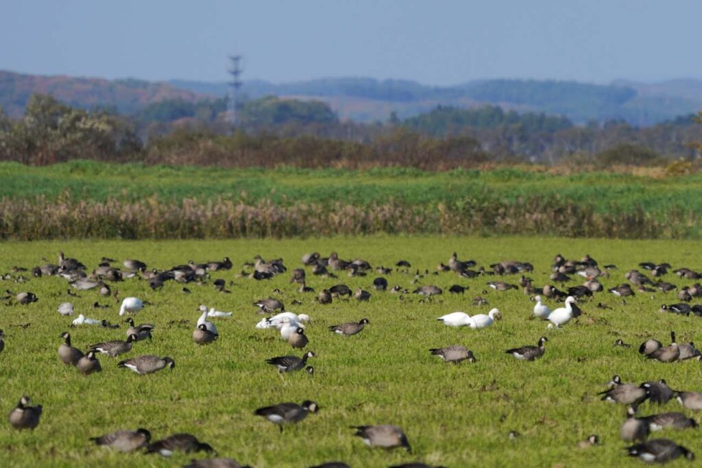 北海道の十勝平野は秋と春にガン類の多くが中継地として利用する場所で、秋は10月、春は4月が渡りのピークになります。ガン類は水域を夜間のねぐらに使用するので、国内のガン類飛来地で個体数調査をするときはねぐらでカウントする場所が多いのですが、十勝平野ではガン類のねぐらがあまり把握できていません。そのため、モニタリングサイト1000ガンカモ類調査では餌場になっている十勝川流域の農地や牧草地でのカウントを行ってきました。