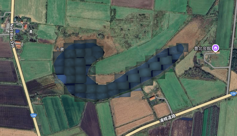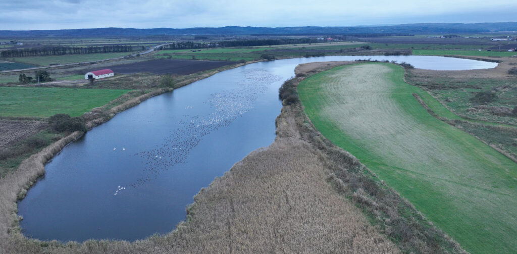 今後はこの地域でもねぐらのカウントを行いたいと考えて、2024年秋からねぐらを探す調査もはじめました。採食地調査グループのまとめ役をしていただいている城石一徹さんからねぐらの可能性がある場所を教えてもらい、自動撮影カメラやドローンを使ってガン類の利用状況を確認をしています。この記事では浦幌町にある三日月沼(図3)のドローン調査を紹介しましょう。