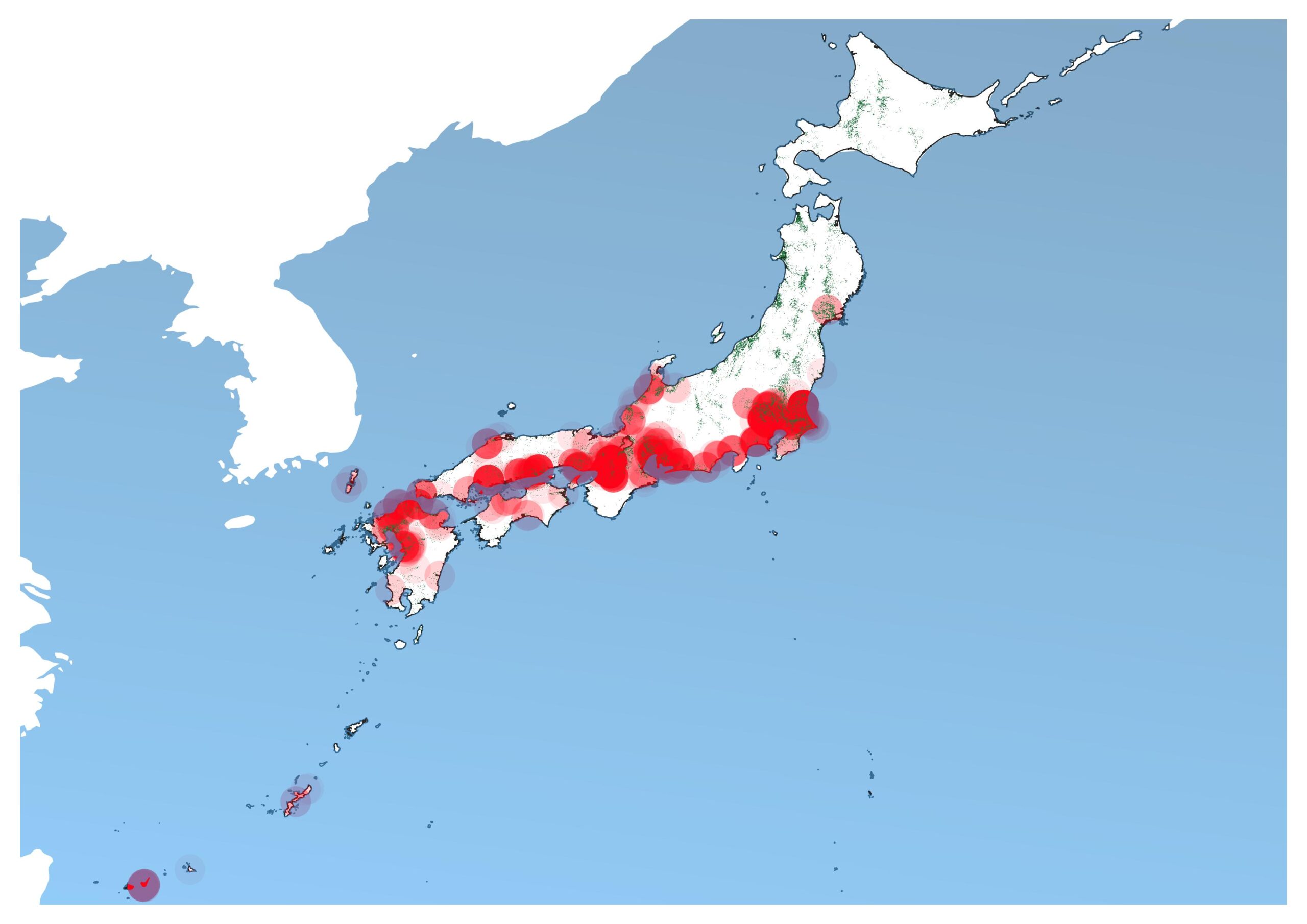 図3の赤色の濃淡は、2000〜2025年繁殖期に収集した全確認地点を起点に半径50kmのバッファを重ね、『観察が多い場所』ほど濃く見えるようにしたものと、Carrascoら 2022 により提供されている水田の推定分布(2015~2019年)を緑で示した図です。地図からは、太平洋側の低地〜内湾沿岸、瀬戸内沿岸など、低地の平野で水田景観が連続する地域、また人口が集まる地域で観察の集積が強く、山間部では薄い傾向が読み取れます。一方で、薄い地域がただちに“不在”を意味するわけではありません。観察者が少ない、夜間に現地へ行きにくいなど、調査や確認のしにくさが分布図に反映されている可能性があります。ただ、これまでの報告などからタマシギは水田・休耕田・湿地を利用していますが、必ずしも人里離れた静かな場所で生活しているとは限らないようです。むしろ、生活しやすい水管理(時期による湛水の有無)、休耕田の植生、捕食者の多寡などの条件の組み合わせが効いていると考えられます。将来的には、観察労力の地域の偏りを解消して、全国の水田・休耕田の分布・気温などの環境指標などと重ね分布の分析していきたいと考えています。