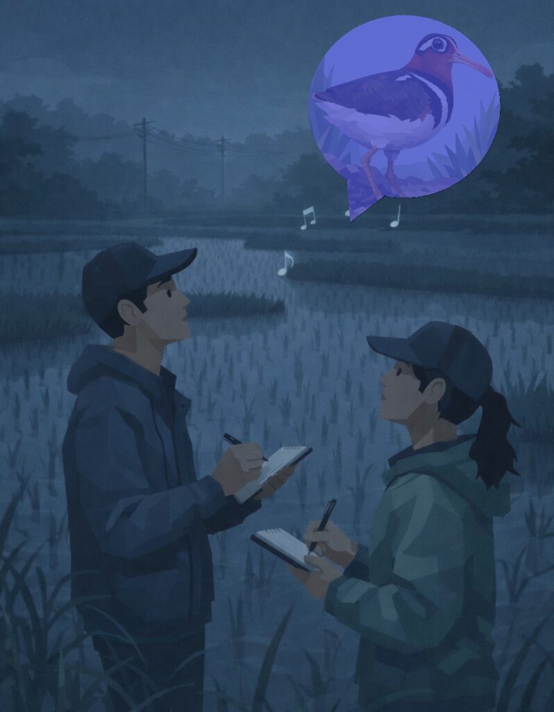 タマシギは環境省レッドリストでVU(絶滅危惧Ⅱ類)とされ、圃場整備や乾田化、休耕田の減少などによる生息地縮小が脅威として挙げられています。しかしながら、なかなか見つけにくく“変化”を拾うには、市民協力によるモニタリングや観察報告が有効だと考えています。参加のポイントはシンプルで、(1) 決めた地点で6分間、(2) 夜間、(3) 同じ場所をシーズン内に3回、で十分に科学的価値がでます。もし確認できなくても、調査したが鳴かなかった情報も、分布推定の精度を上げる“重要データ”です。また別途、録音・写真の情報も、同定の再確認ができ誤同定リスクも下がり期調査情報となります。