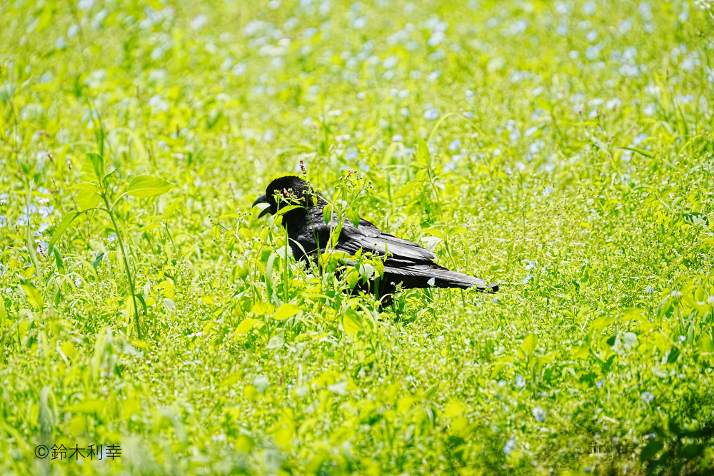 私がガイドボランティアを務めマイフィールドの一つでもある都内近郊の都市公園。まさに春のフラワーフェスティバル真っ盛りで色とりどりのチューリップやエビネ、遅咲きの桜など様々な花に囲まれた原っぱの一角で柔らかな春の日差しを浴びてのんびりしている若いハシブトガラスを見つけました。程よい距離を保って互いの穏やかな気分を乱さぬようにそっとシャッターを切りました。