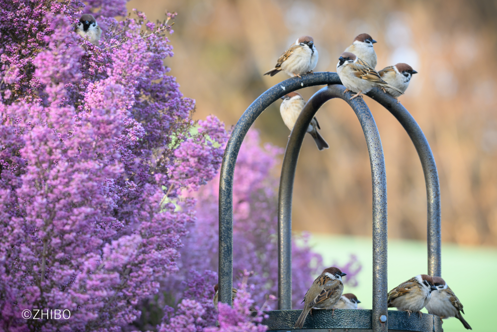 柔らかな春の光の中、紫の花の傍らで開かれた小さな円卓会議。それぞれの一羽が静かにうなずき、さえずりが風に溶けていきます。今日の議題は――「もうすぐ来る新しい季節」でしょうか。